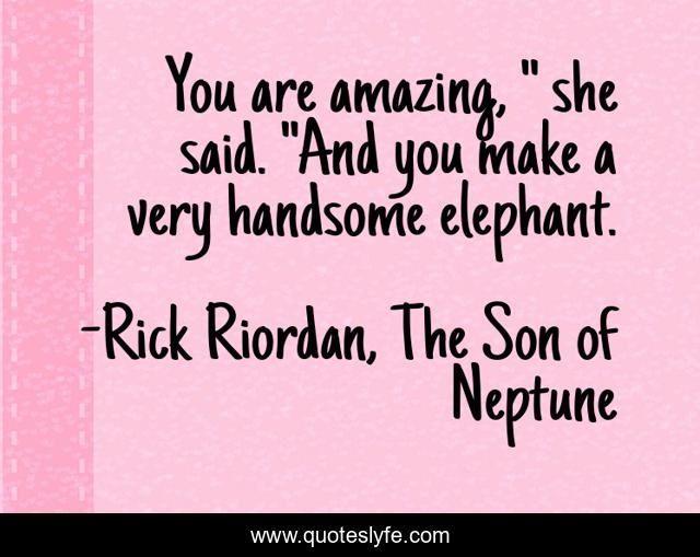 This page presents the quote "You are amazing, " she said. "And you make a very handsome elephant.". Author of this quote is Rick Riordan, The Son of Neptune. This quote is about cute, frank, comedy, hazel, funny,.