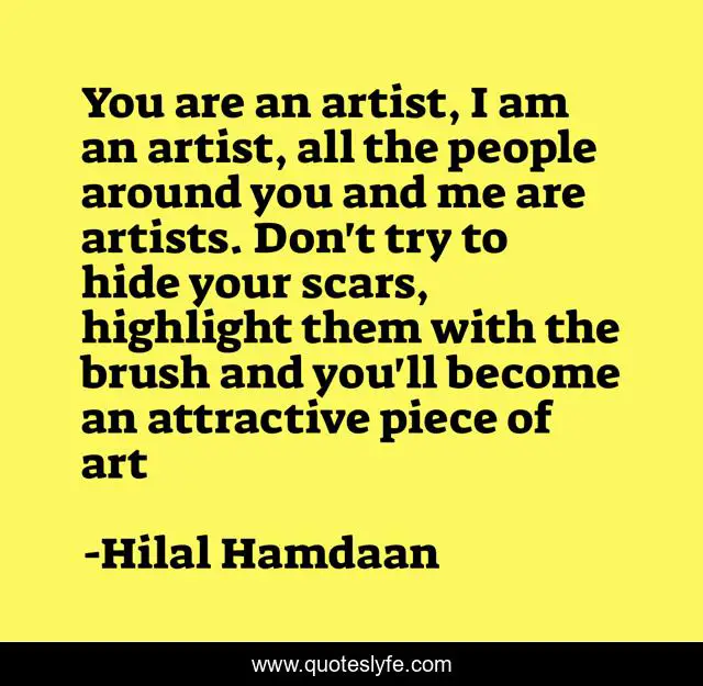 This page presents the quote "You are an artist, I am an artist, all the people around you and me are artists. Don't try to hide your scars, highlight them with the brush and you'll become an attractive piece of art". Author of this quote is Hilal Hamdaan. This quote is about insprational, self-help,.