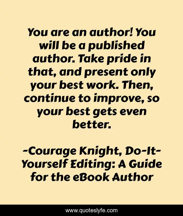 This page presents the quote "You are an author! You will be a published author. Take pride in that, and present only your best work. Then, continue to improve, so your best gets even better.". Author of this quote is Courage Knight, Do-It-Yourself Editing: A Guide for the eBook Author. This quote is about writing-craft, writing-advice, punctuation, writing, grammar, editing,.