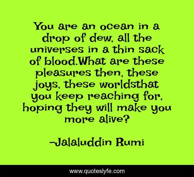 This page presents the quote "You are an ocean in a drop of dew, all the universes in a thin sack of blood.What are these pleasures then, these joys, these worldsthat you keep reaching for, hoping they will make you more alive?". Author of this quote is Jalaluddin Rumi. This quote is about living, life, self, happiness,.