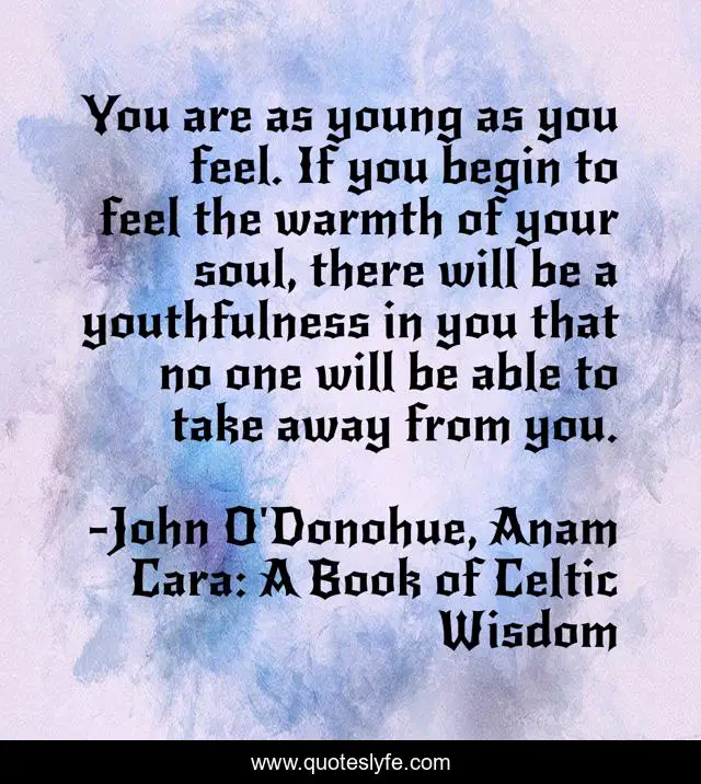 This page presents the quote "You are as young as you feel. If you begin to feel the warmth of your soul, there will be a youthfulness in you that no one will be able to take away from you.". Author of this quote is John O'Donohue, Anam Cara: A Book of Celtic Wisdom. .