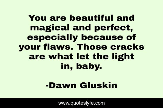 This page presents the quote "You are beautiful and magical and perfect, especially because of your flaws. Those cracks are what let the light in, baby.". Author of this quote is Dawn Gluskin. This quote is about beautiful, light, vulnerability, imperfections, magical,.