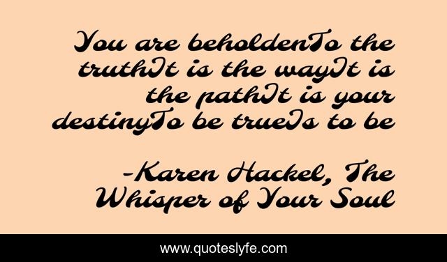 This page presents the quote "You are beholdenTo the truthIt is the wayIt is the pathIt is your destinyTo be trueIs to be". Author of this quote is Karen Hackel, The Whisper of Your Soul. This quote is about living, life, destiny, soul, true-self, truth, true, new-age,.