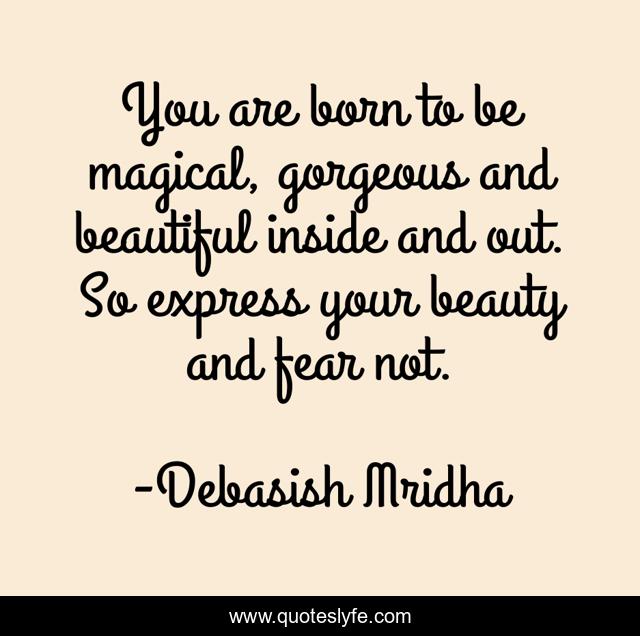 This page presents the quote "You are born to be magical, gorgeous and beautiful inside and out. So express your beauty and fear not.". Author of this quote is Debasish Mridha. This quote is about beautiful, philosophy, beauty, you-are-born-to-be-magical, debasish-mridha, magical, quotes, inspirational, gorgeous,.
