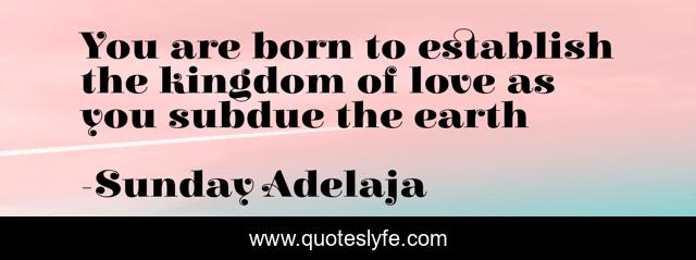 This page presents the quote "You are born to establish the kingdom of love as you subdue the earth". Author of this quote is Sunday Adelaja. This quote is about kingdom, love, subdue, kingdom-of-love, earth, establish, affection,.