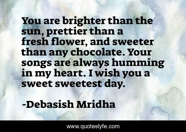 This page presents the quote "You are brighter than the sun, prettier than a fresh flower, and sweeter than any chocolate. Your songs are always humming in my heart. I wish you a sweet sweetest day.". Author of this quote is Debasish Mridha. This quote is about sweetest-day-greeting, sweetest-day, philosophy, debasish-mridha, sweetest-day-wish, quotes, you-are-brighter-than-the-sun, debasish-mridha-md, inspirational,.