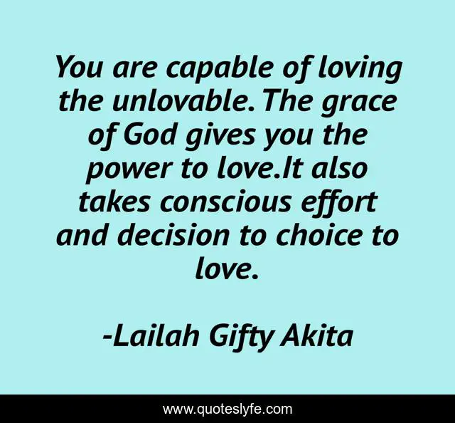 This page presents the quote "You are capable of loving the unlovable. The grace of God gives you the power to love.It also takes conscious effort and decision to choice to love.". Author of this quote is Lailah Gifty Akita. This quote is about love, affection,.