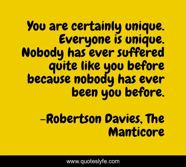 This page presents the quote "You are certainly unique. Everyone is unique. Nobody has ever suffered quite like you before because nobody has ever been you before.". Author of this quote is Robertson Davies, The Manticore. .