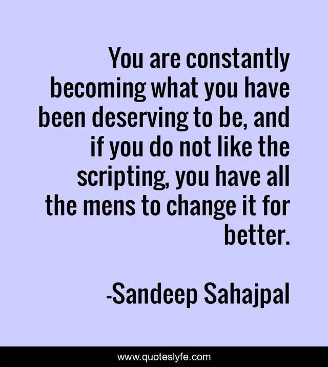 This page presents the quote "You are constantly becoming what you have been deserving to be, and if you do not like the scripting, you have all the mens to change it for better.". Author of this quote is Sandeep Sahajpal. This quote is about life, destiny, change,.