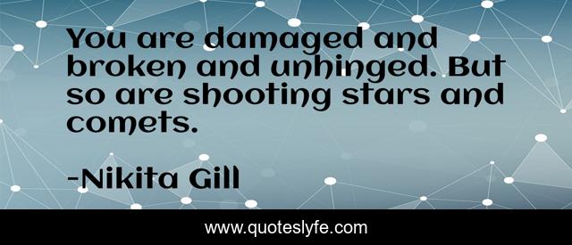 This page presents the quote "You are damaged and broken and unhinged. But so are shooting stars and comets.". Author of this quote is Nikita Gill. This quote is about comets, confidence, strength, love, romantic, relationship, damaged-people, positive-thinking, broken,.