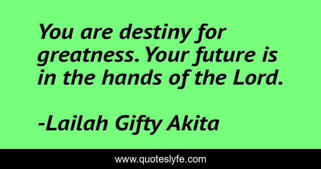 This page presents the quote "You are destiny for greatness. Your future is in the hands of the Lord.". Author of this quote is Lailah Gifty Akita. This quote is about future-plans, future-of-man, great-expectations, great, great-work, future, greatness, lord, great-men,.