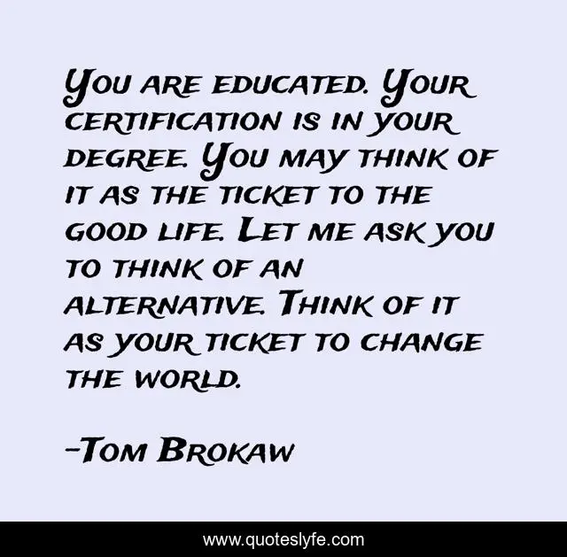 This page presents the quote "You are educated. Your certification is in your degree. You may think of it as the ticket to the good life. Let me ask you to think of an alternative. Think of it as your ticket to change the world.". Author of this quote is Tom Brokaw. This quote is about life, good, change,.