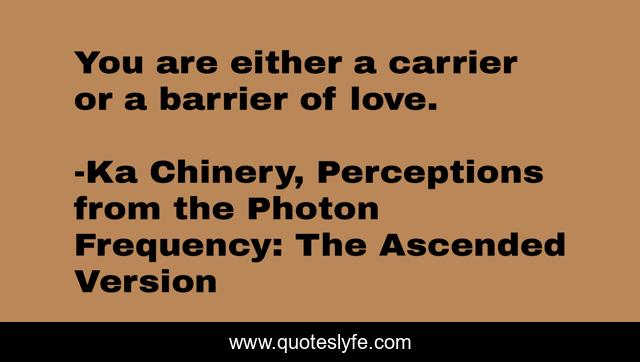 This page presents the quote "You are either a carrier or a barrier of love.". Author of this quote is Ka Chinery, Perceptions from the Photon Frequency: The Ascended Version. This quote is about love, lovequotes, affection, love-hurts,.
