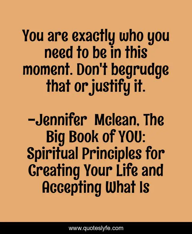 This page presents the quote "You are exactly who you need to be in this moment. Don't begrudge that or justify it.". Author of this quote is Jennifer Mclean, The Big Book of YOU: Spiritual Principles for Creating Your Life and Accepting What Is. This quote is about spiritual-growth, love, inspirational, affection, enthusiasm,.