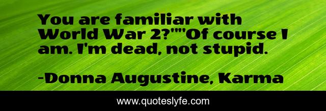 This page presents the quote "You are familiar with World War 2?""Of course I am. I'm dead, not stupid.". Author of this quote is Donna Augustine, Karma. This quote is about urban-fantasy, karma, fate,.