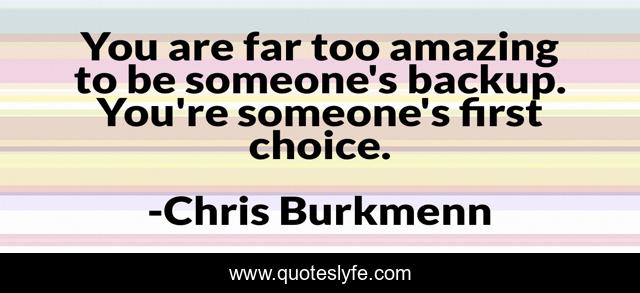 This page presents the quote "You are far too amazing to be someone's backup. You're someone's first choice.". Author of this quote is Chris Burkmenn. This quote is about relationships, faith, life, right, love, divorce, believe, jesus, lonely,.