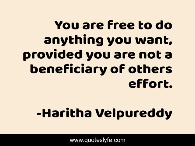 This page presents the quote "You are free to do anything you want, provided you are not a beneficiary of others effort.". Author of this quote is Haritha Velpureddy. This quote is about freedom, wisdom, inspirational, enthusiasm,.