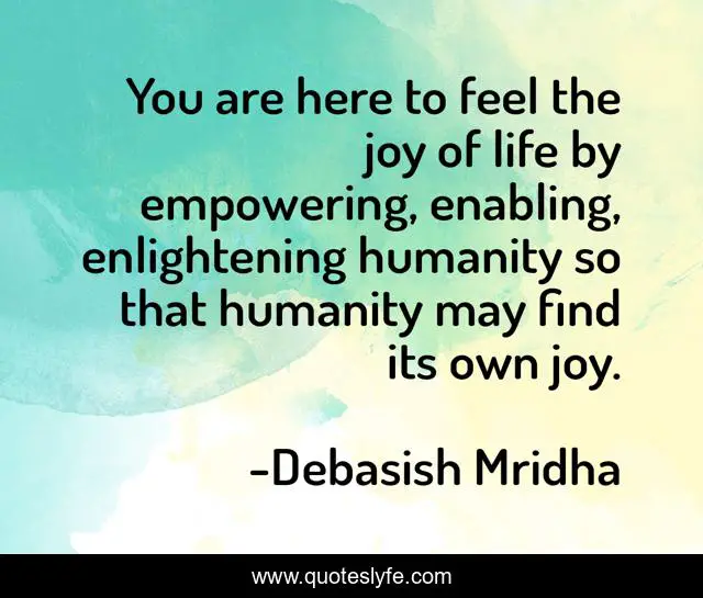 This page presents the quote "You are here to feel the joy of life by empowering, enabling, enlightening humanity so that humanity may find its own joy.". Author of this quote is Debasish Mridha. This quote is about empowering, life, philosophy, enlightening, joy, debasish, debasish-mridha, enabling, mridha,.
