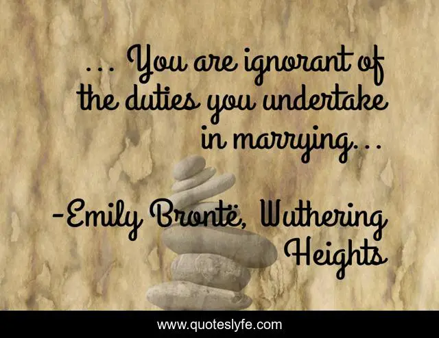 This page presents the quote "... You are ignorant of the duties you undertake in marrying...". Author of this quote is Emily Brontë, Wuthering Heights. .