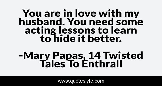 This page presents the quote "You are in love with my husband. You need some acting lessons to learn to hide it better.". Author of this quote is Mary Papas, 14 Twisted Tales To Enthrall. This quote is about short-stories, books, writing-style, authors,.