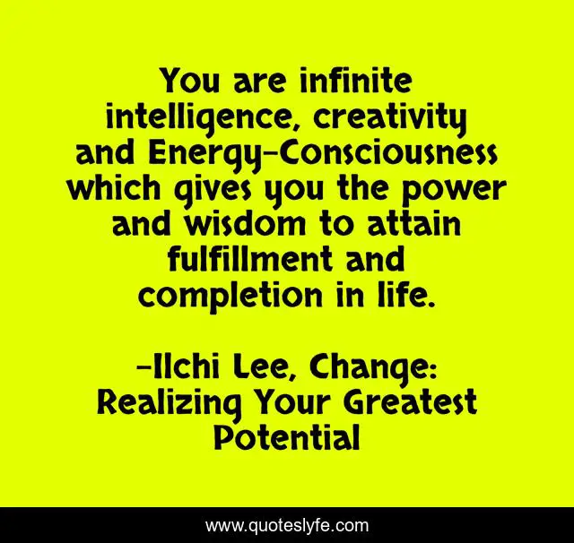 This page presents the quote "You are infinite intelligence, creativity and Energy-Consciousness which gives you the power and wisdom to attain fulfillment and completion in life.". Author of this quote is Ilchi Lee, Change: Realizing Your Greatest Potential. This quote is about enthusiasm, inspirational, self-development,.