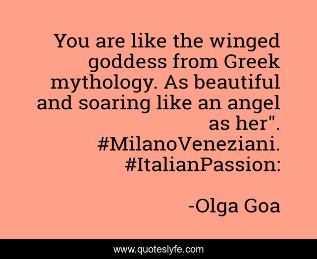 This page presents the quote "You are like the winged goddess from Greek mythology. As beautiful and soaring like an angel as her". #MilanoVeneziani. #ItalianPassion:". Author of this quote is Olga Goa. This quote is about book, italy, italianpassion, english, books, russian-literature, book-worm, italian-literature, lovequotes,.