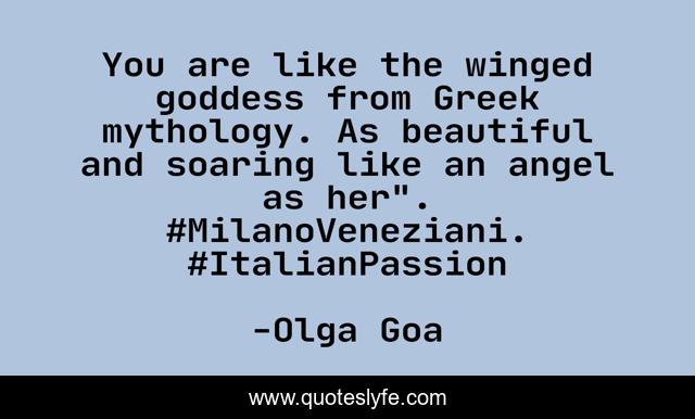 This page presents the quote "You are like the winged goddess from Greek mythology. As beautiful and soaring like an angel as her". #MilanoVeneziani. #ItalianPassion". Author of this quote is Olga Goa. This quote is about book, italy, italianpassion, english, books, russian-literature, book-worm, italian-literature, lovequotes,.