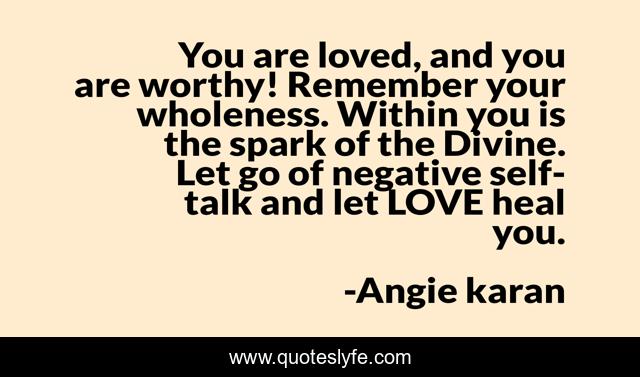 This page presents the quote "You are loved, and you are worthy! Remember your wholeness. Within you is the spark of the Divine. Let go of negative self-talk and let LOVE heal you.". Author of this quote is Angie karan. This quote is about let-love-heal-you, love, spark-of-the-divine, healing, affection,.