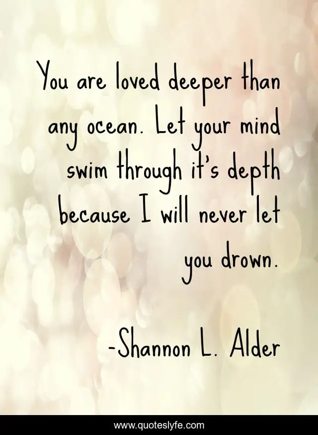 This page presents the quote "You are loved deeper than any ocean. Let your mind swim through it's depth because I will never let you drown.". Author of this quote is Shannon L. Alder. This quote is about love, deep, affection, ocean,.