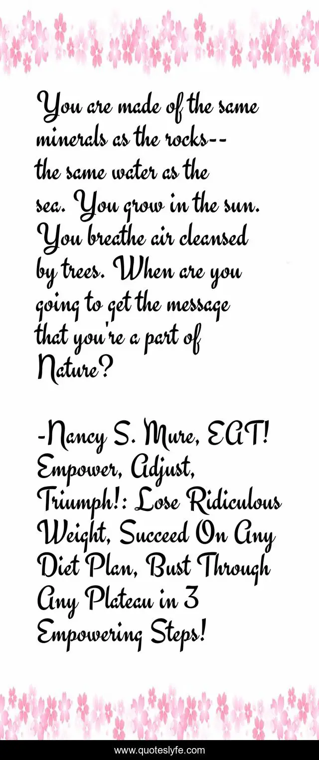 This page presents the quote "You are made of the same minerals as the rocks--the same water as the sea. You grow in the sun. You breathe air cleansed by trees. When are you going to get the message that you're a part of Nature?". Author of this quote is Nancy S. Mure, EAT! Empower, Adjust, Triumph!: Lose Ridiculous Weight, Succeed On Any Diet Plan, Bust Through Any Plateau in 3 Empowering Steps!. This quote is about plant-based, organic, nature, lose-ridiculous-weight, mure, trees, air, water, weight-loss,.