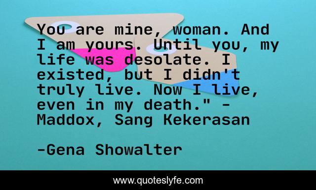 This page presents the quote "You are mine, woman. And I am yours. Until you, my life was desolate. I existed, but I didn't truly live. Now I live, even in my death." - Maddox, Sang Kekerasan". Author of this quote is Gena Showalter. This quote is about paranormal-romance, romance-novels,.