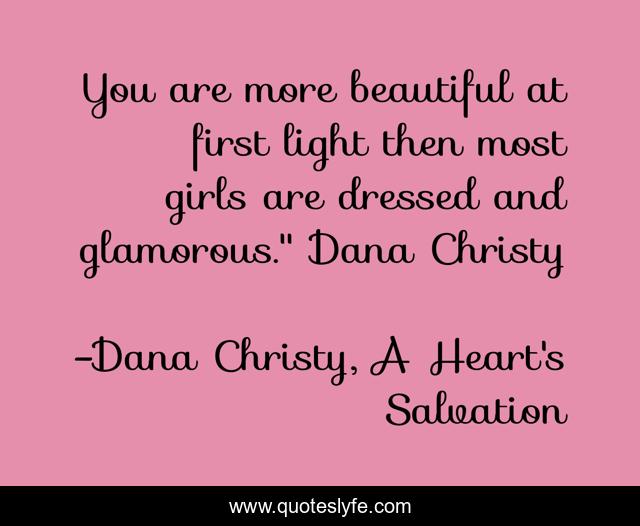This page presents the quote "You are more beautiful at first light then most girls are dressed and glamorous." Dana Christy". Author of this quote is Dana Christy, A Heart's Salvation. This quote is about book-boyfriend, romance, young-adult-romance, romantic-suspense,.