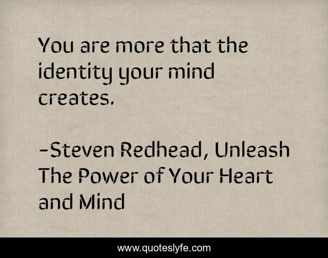 This page presents the quote "You are more that the identity your mind creates.". Author of this quote is Steven Redhead, Unleash The Power of Your Heart and Mind. This quote is about create, mind, identity,.