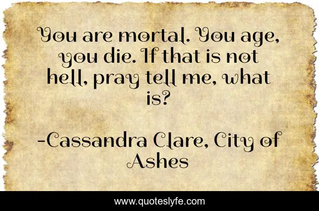 This page presents the quote "You are mortal. You age, you die. If that is not hell, pray tell me, what is?". Author of this quote is Cassandra Clare, City of Ashes. This quote is about life, death, city-of-ashes, age, humans, mortal,.