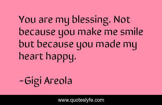 This page presents the quote "You are my blessing. Not because you make me smile but because you made my heart happy.". Author of this quote is Gigi Areola. This quote is about smile, happy-ending, blessings, happiness,.