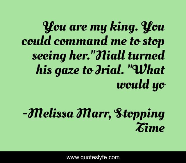 This page presents the quote "You are my king. You could command me to stop seeing her."Niall turned his gaze to Irial. "What would yo". Author of this quote is Melissa Marr, Stopping Time. This quote is about ink-exchange, love, sight, irial, loyalty, niall, wicked-lovely, affection,.