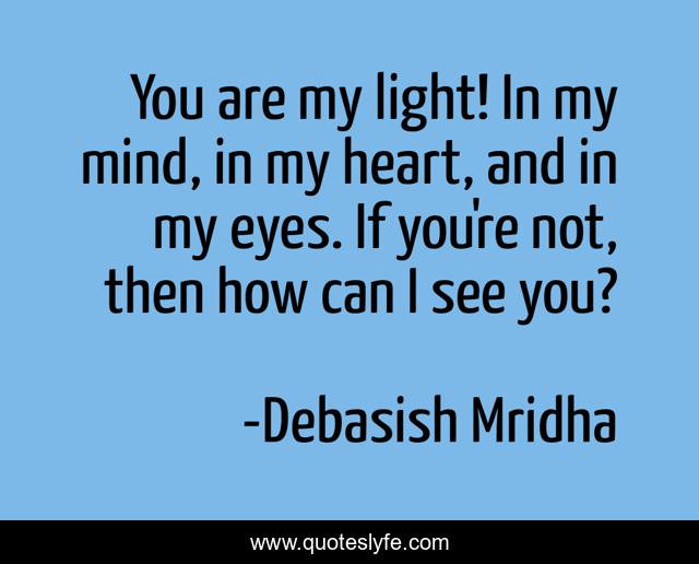 This page presents the quote "You are my light! In my mind, in my heart, and in my eyes. If you're not, then how can I see you?". Author of this quote is Debasish Mridha. This quote is about life, love, knowledge, inspirational, intelligence, philosophy, wisdom, quotes, affection,.