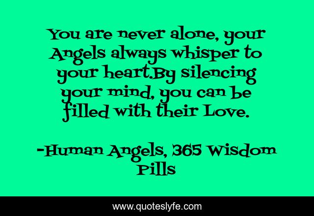 This page presents the quote "You are never alone, your Angels always whisper to your heart.By silencing your mind, you can be filled with their Love.". Author of this quote is Human Angels, 365 Wisdom Pills. This quote is about angel, angels, silence, unconditional-love,.