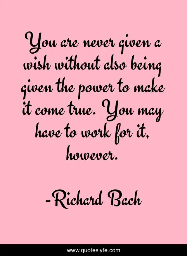 This page presents the quote "You are never given a wish without also being given the power to make it come true. You may have to work for it, however.". Author of this quote is Richard Bach. This quote is about wish, power,.