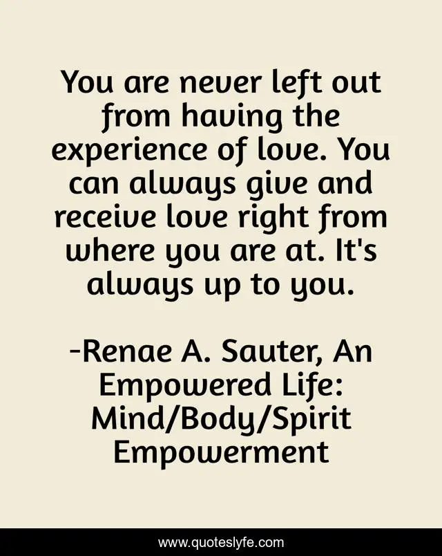 This page presents the quote "You are never left out from having the experience of love. You can always give and receive love right from where you are at. It's always up to you.". Author of this quote is Renae A. Sauter, An Empowered Life: Mind/Body/Spirit Empowerment. This quote is about empowerment, love, psychology, personal-growth, spiritual, self-development, self-worth, mental-health, mind-body-spirit,.