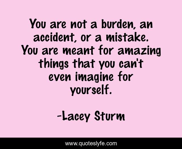 This page presents the quote "You are not a burden, an accident, or a mistake. You are meant for amazing things that you can't even imagine for yourself.". Author of this quote is Lacey Sturm. This quote is about encouragement, spirituality, purpose, inspirational, enthusiasm, mosley, flyleaf, nicole,.