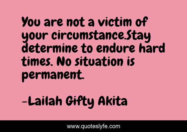 This page presents the quote "You are not a victim of your circumstance.Stay determine to endure hard times. No situation is permanent.". Author of this quote is Lailah Gifty Akita. This quote is about endurance, persistent-actions,.