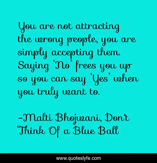 This page presents the quote "You are not attracting the wrong people, you are simply accepting them. Saying ‘No’ frees you up so you can say ‘Yes’ when you truly want to.". Author of this quote is Malti Bhojwani, Don't Think Of a Blue Ball. This quote is about love, relationship, wife, wrong-women, husband, wrong-men, affection, attracting,.
