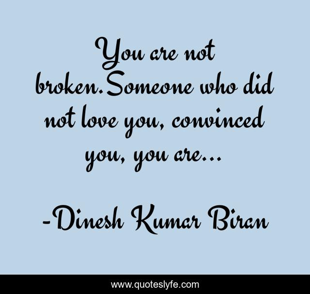 This page presents the quote "You are not broken.Someone who did not love you, convinced you, you are...". Author of this quote is Dinesh Kumar Biran. This quote is about life, positive, heatbreak, motivational, confidence, hurt, broken, optimistic, life-lessons,.
