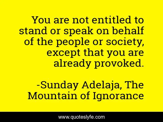 This page presents the quote "You are not entitled to stand or speak on behalf of the people or society, except that you are already provoked.". Author of this quote is Sunday Adelaja, The Mountain of Ignorance. This quote is about mountain, life, darkness, entitlement, danger, god, people, ignorance, power,.