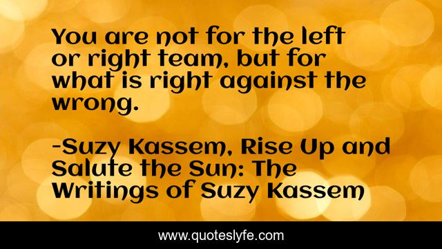This page presents the quote "You are not for the left or right team, but for what is right against the wrong.". Author of this quote is Suzy Kassem, Rise Up and Salute the Sun: The Writings of Suzy Kassem. This quote is about right, fair, just, justice, unjust, unfair, standing-alone, wrong, corrupt-corruption,.
