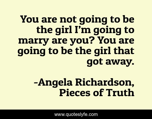 This page presents the quote "You are not going to be the girl I’m going to marry are you? You are going to be the girl that got away.". Author of this quote is Angela Richardson, Pieces of Truth. This quote is about regret, love-lost,.