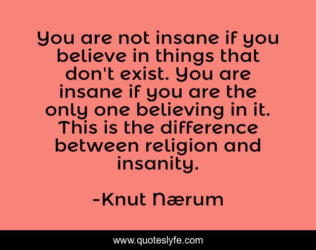 This page presents the quote "You are not insane if you believe in things that don't exist. You are insane if you are the only one believing in it. This is the difference between religion and insanity.". Author of this quote is Knut Nærum. .