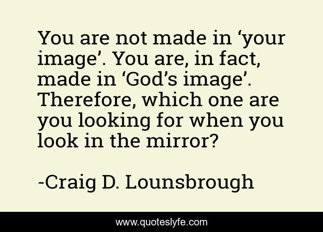 This page presents the quote "You are not made in ‘your image’. You are, in fact, made in ‘God’s image’. Therefore, which one are you looking for when you look in the mirror?". Author of this quote is Craig D. Lounsbrough. This quote is about christian, reflection, god, image, jesus, self, mirror, self-concept, identity,.