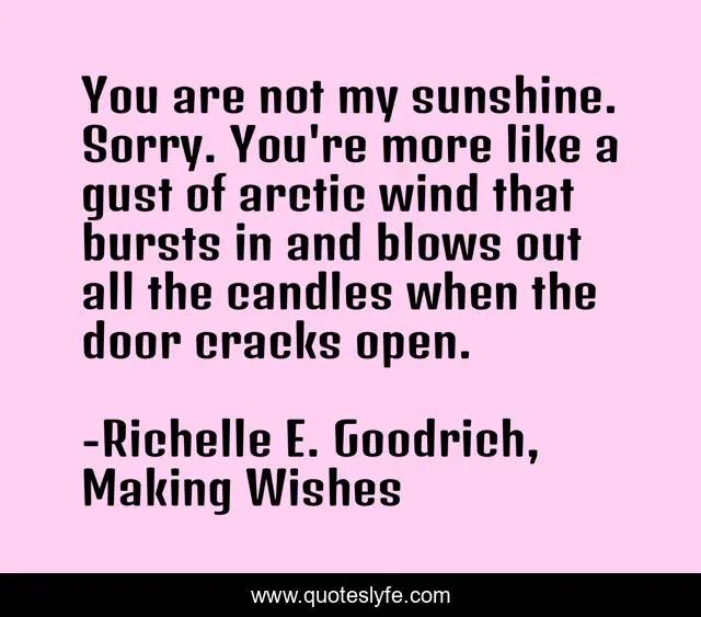 This page presents the quote "You are not my sunshine. Sorry. You're more like a gust of arctic wind that bursts in and blows out all the candles when the door cracks open.". Author of this quote is Richelle E. Goodrich, Making Wishes. This quote is about fool, annoyance, richelle, jerk, spoiler, richelle-e-goodrich, sunshine, rascal, arctic-wind,.